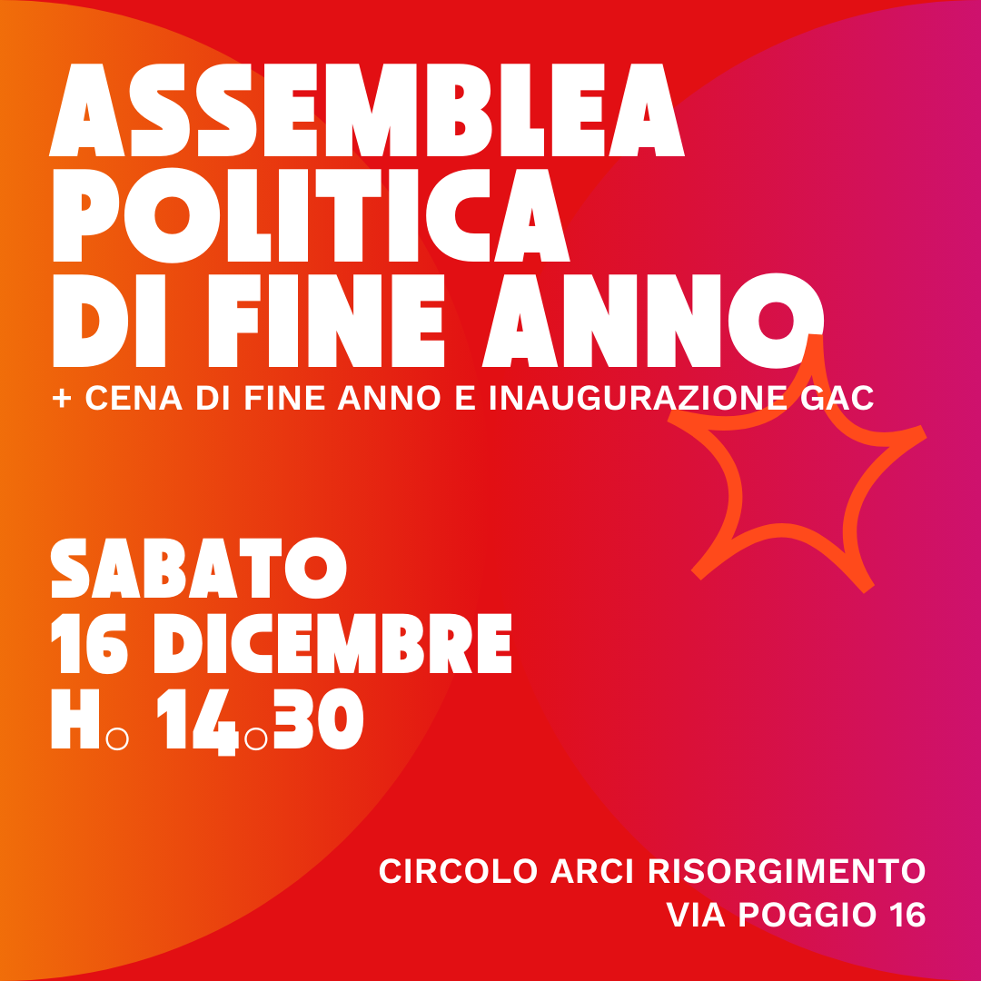 Siamo giunti al termine di questo anno che ci ha visto impegnat* su diversi fronti. Come tutti gli anni, ci teniamo a concludere l’anno con l’ASSEMBLEA POLITICA, che è convocata per SABATO 16 dicembre alle h.14.30.