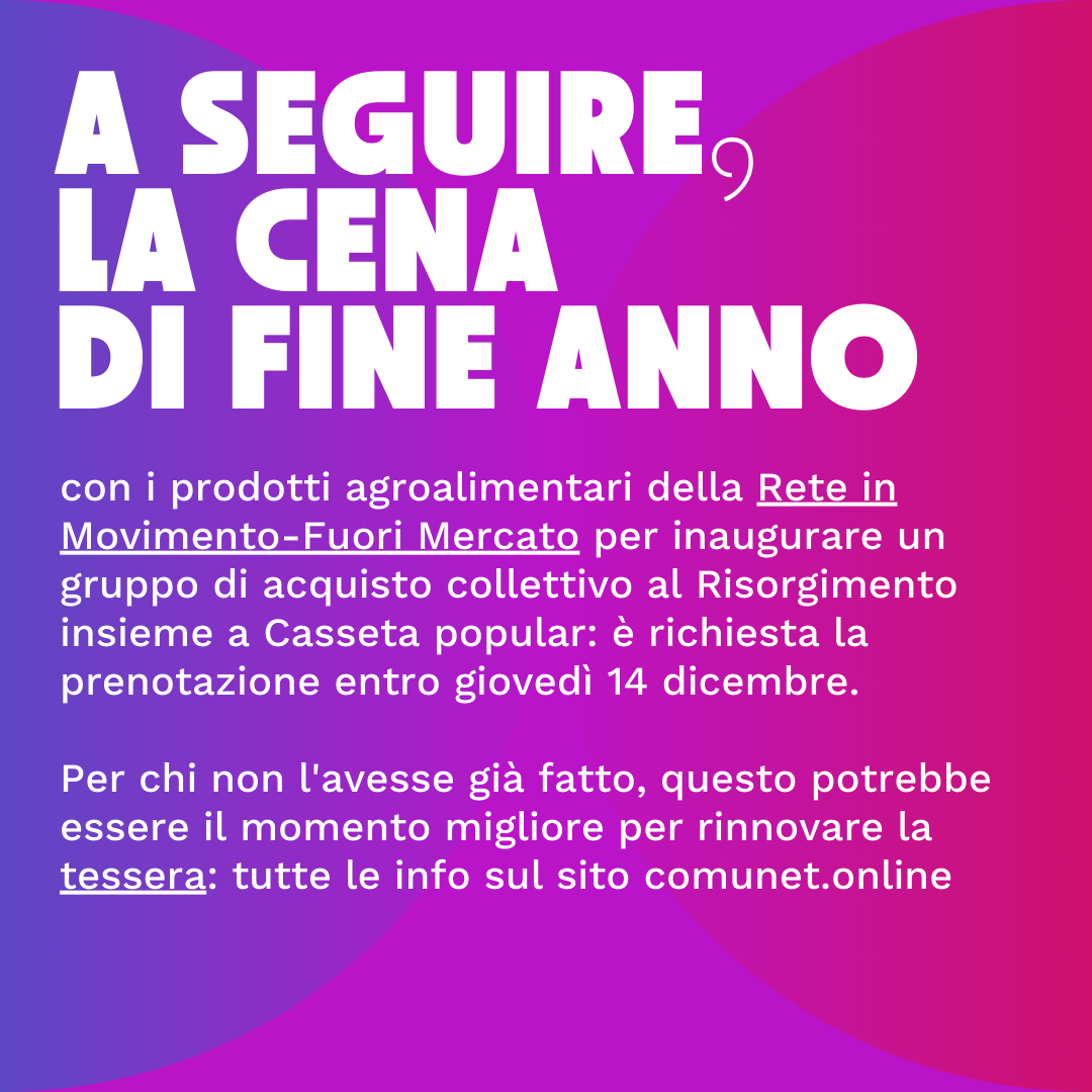 A seguire, LA CENA DI FINE ANNO con i prodotti agroalimentari della Rete in Movimento-Fuori Mercato: è richiesta la prenotazione entro giovedì 14 dicembre a questo link: https://forms.gle/Gpey6MabW8NBDXex5
